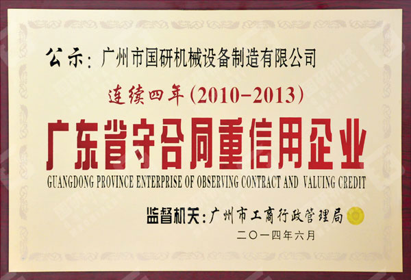 2014年7月,广州市乐竞_乐竞(中国)设备制造有限公司获得由广东省工商行政管理局授予的2013年度“广州省守合同重信用企业”荣誉称号。这是公司连续多年来多次获此殊荣。