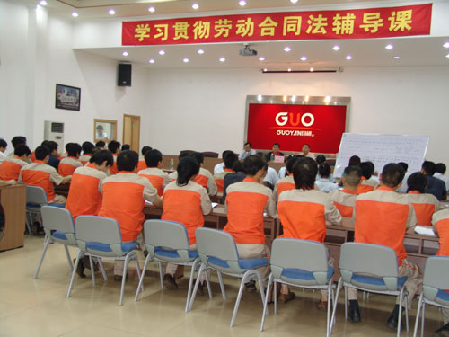 5月9日下午,广州市国砚实业发展有限公司、广州市乐竞_乐竞(中国)设备制造有限公司在总部大会议厅举行了声势浩大的学习《劳动合同法》活动。该活动由公司党支部书记、副总经理王声跃主持,广东注明律师事务所——广东德法理律师事务所、我司常年法律顾问黄文芳主任律师担任主讲。