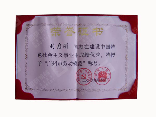广州市委、市政府授予刘启刚同志广州市劳动模范奖状