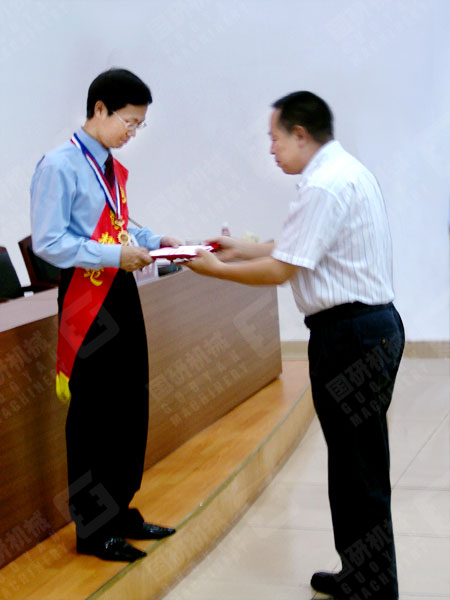 大会在庄严的国歌声中拉开了序幕。胸戴大红花,身披绶带的广州市劳动模范、乐竞_乐竞(中国)市场部经理刘启刚同志受到了公司领导和全体员工的热烈欢迎。董事长兼总经理王声位亲自为刘启刚同志佩戴广州市委、市政府颁发的广州市劳动模范奖状并颁发奖金。