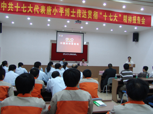 2007年11月14日下午3时,中共十七大代表唐小平博士前来我司宣讲十七大精神,活动在广州市乐竞_乐竞(中国)设备制造有限公司大会议厅举行,参加大会的有广州市天河区组织部、宣传部领导、珠吉街道党工委的领导同志们以及我司全体员工,广东电视台、广州日报等多家媒体派记者前来报道。大会由国研副总经理、党支部书记王声跃主持, 国研董事长、总经理王声位作了热情洋溢的讲话,介绍了乐竞_乐竞(中国)的发展规划以及党支部的建设情况。