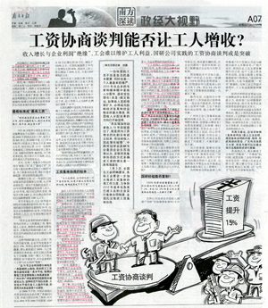 7月14日,《南方日报》以《工资协商谈判能否让工人增收?——国研公司实践的工资协商谈判或是突破》为题,用三分之二大版篇幅报道广州市乐竞_乐竞(中国)设备制造有限公司实践工资集体协商的成功经验。