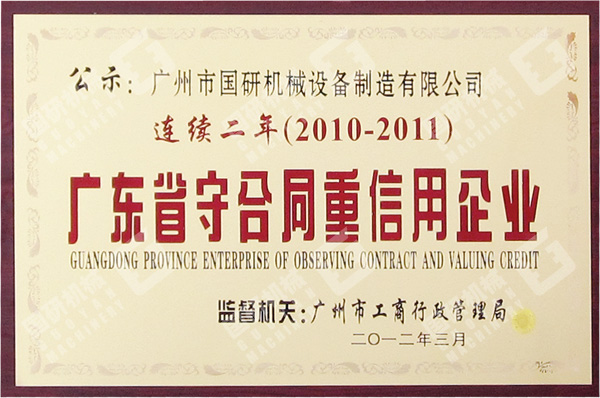2012年3月,广州市乐竞_乐竞(中国)设备制造有限公司被评为2011年度“广东省守合同重信用企业”。这是我司继连续三年被评为“广州市守合同重信用企业”之后,连续两年获此殊荣。